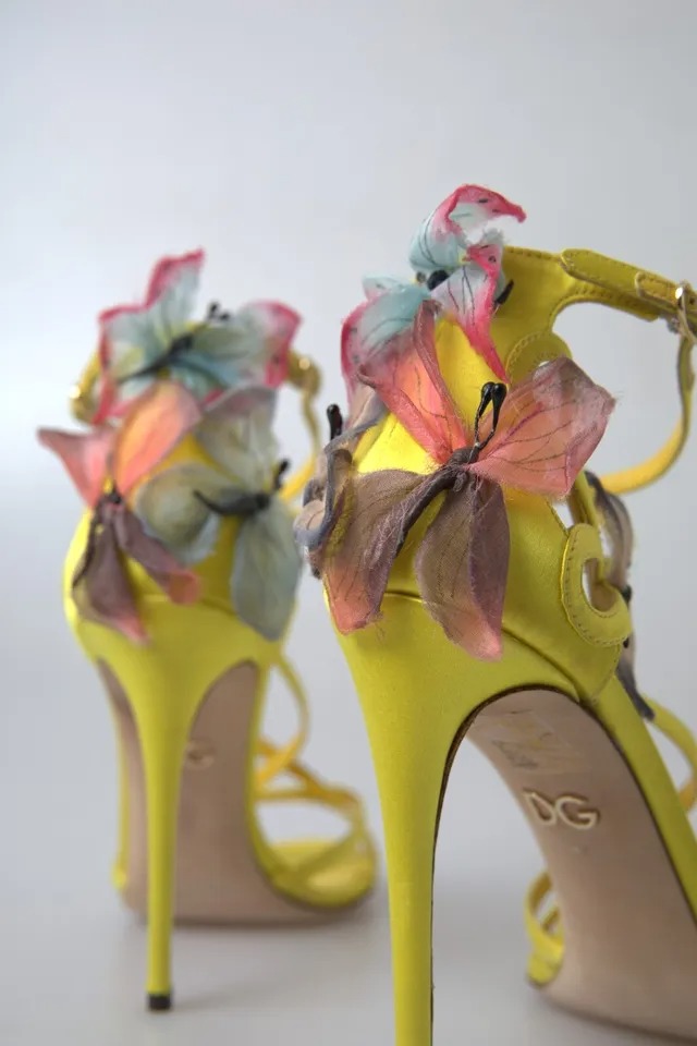 Gorgeous preowned with tags, 100% Authentic Dolce & Gabbana shoes satin strap sandals detailed with adjustable ankle straps, and floral butterfly embellished back side and heel, stiletto heel and leather sole.